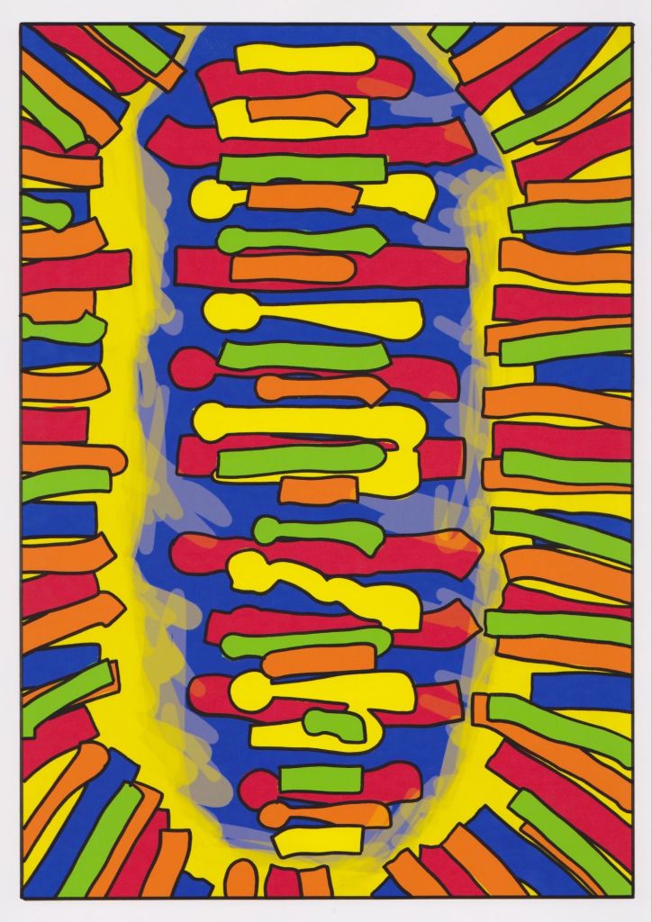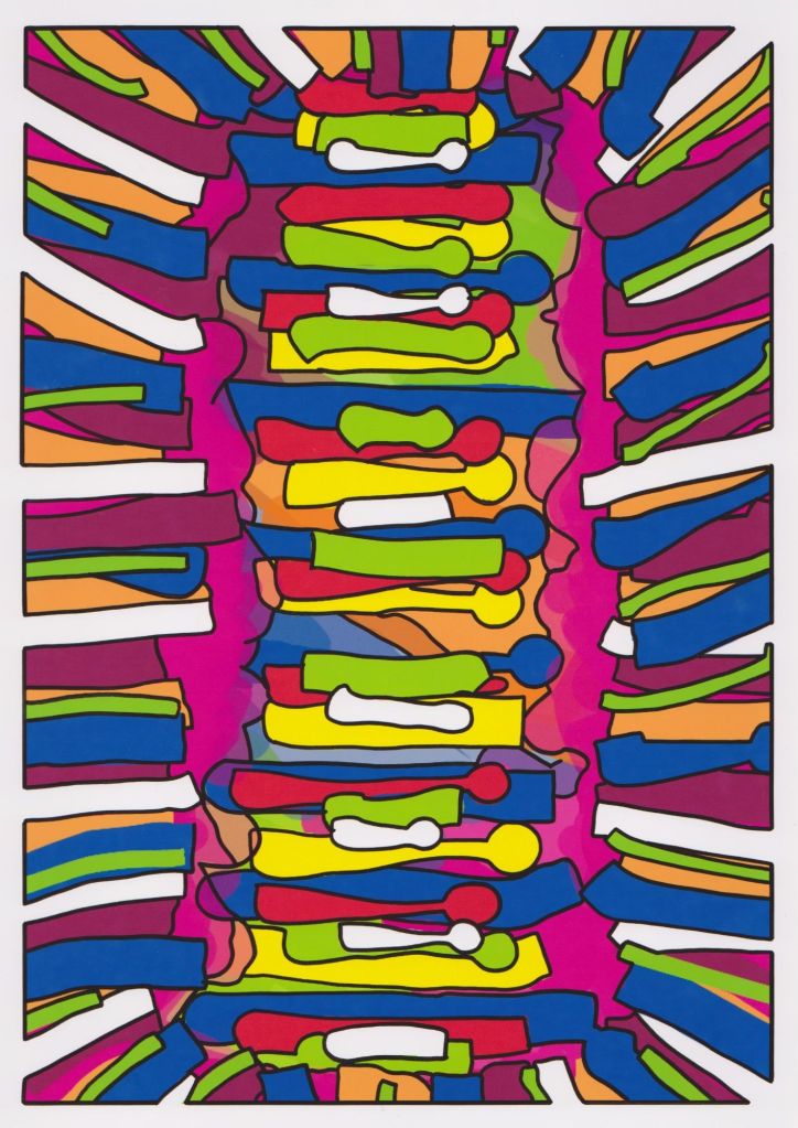 These are drawings done on the phone, printed and worked back into with ink. Banners, barriers or shields.
