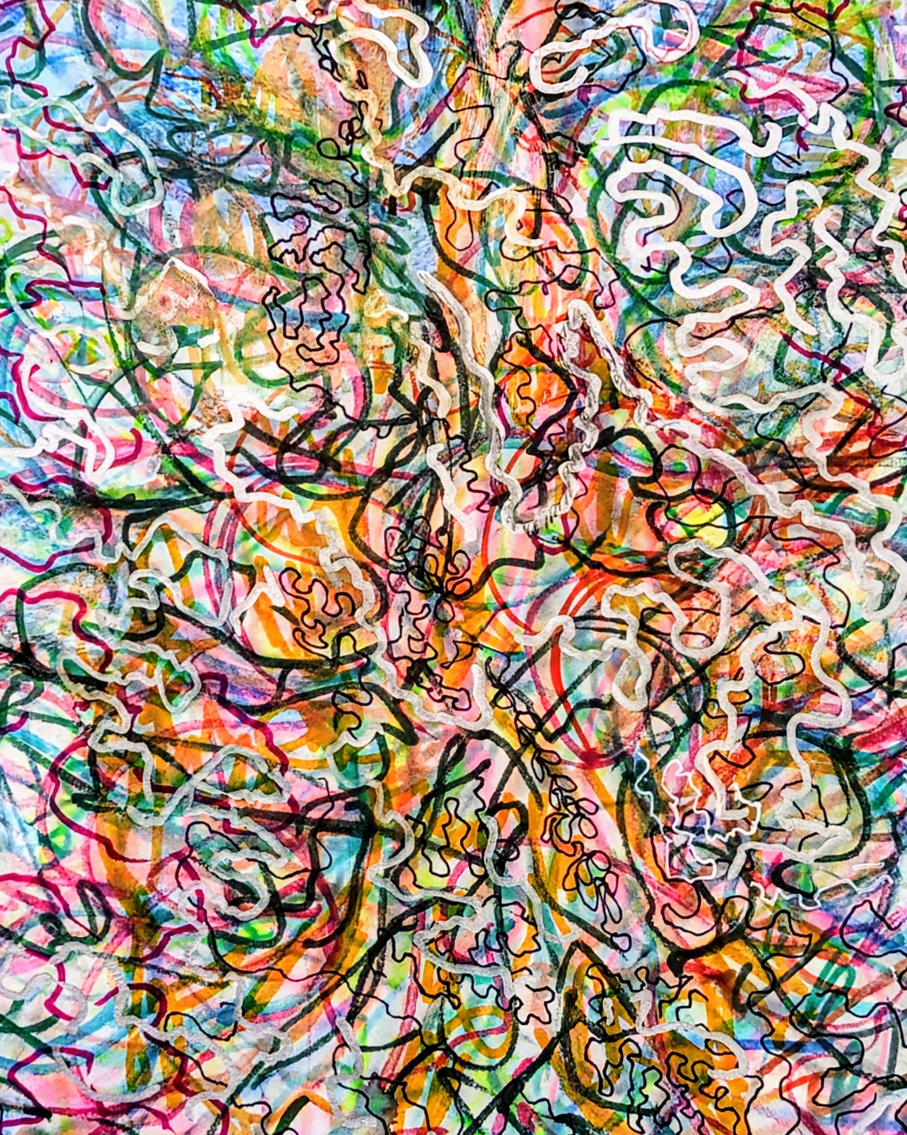 Like Fragmentation and Silly String this is a strandy, wiry, itchy, wiggly or squiggly one (technical terms). Built up in layers with a variety of inks/pens I wanted to make a mass or a form which was a collection of individual stroked or ‘marks’ of the pen. I used tippex and olive oil to try and damp out some of the extraneous frizziness and it became this hair-like brain form.