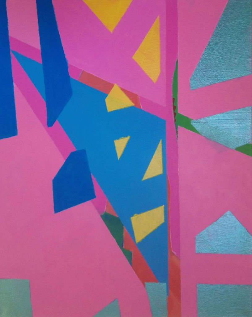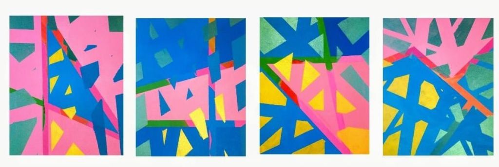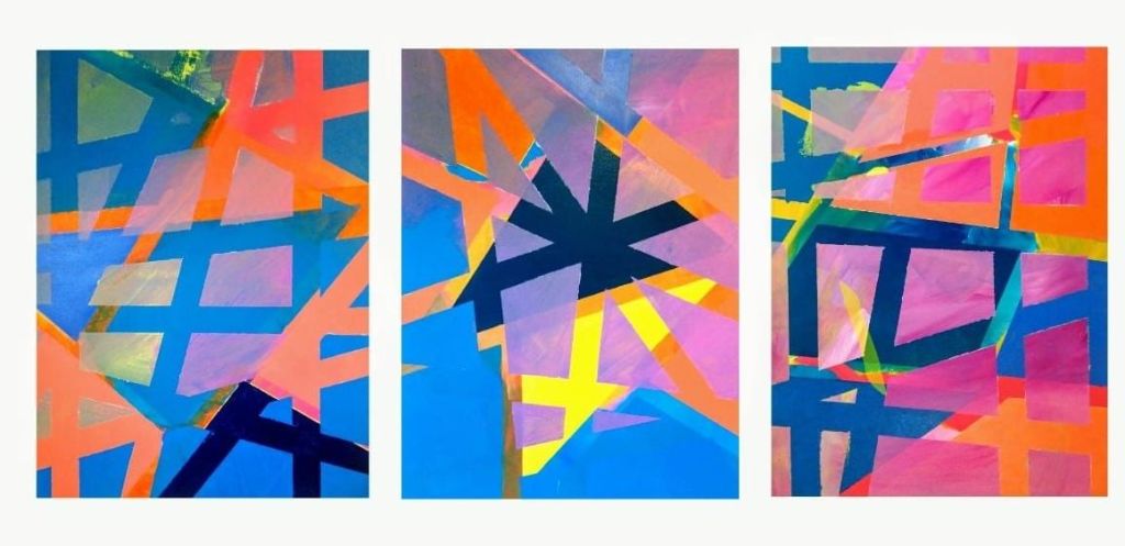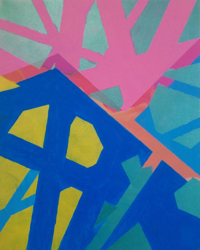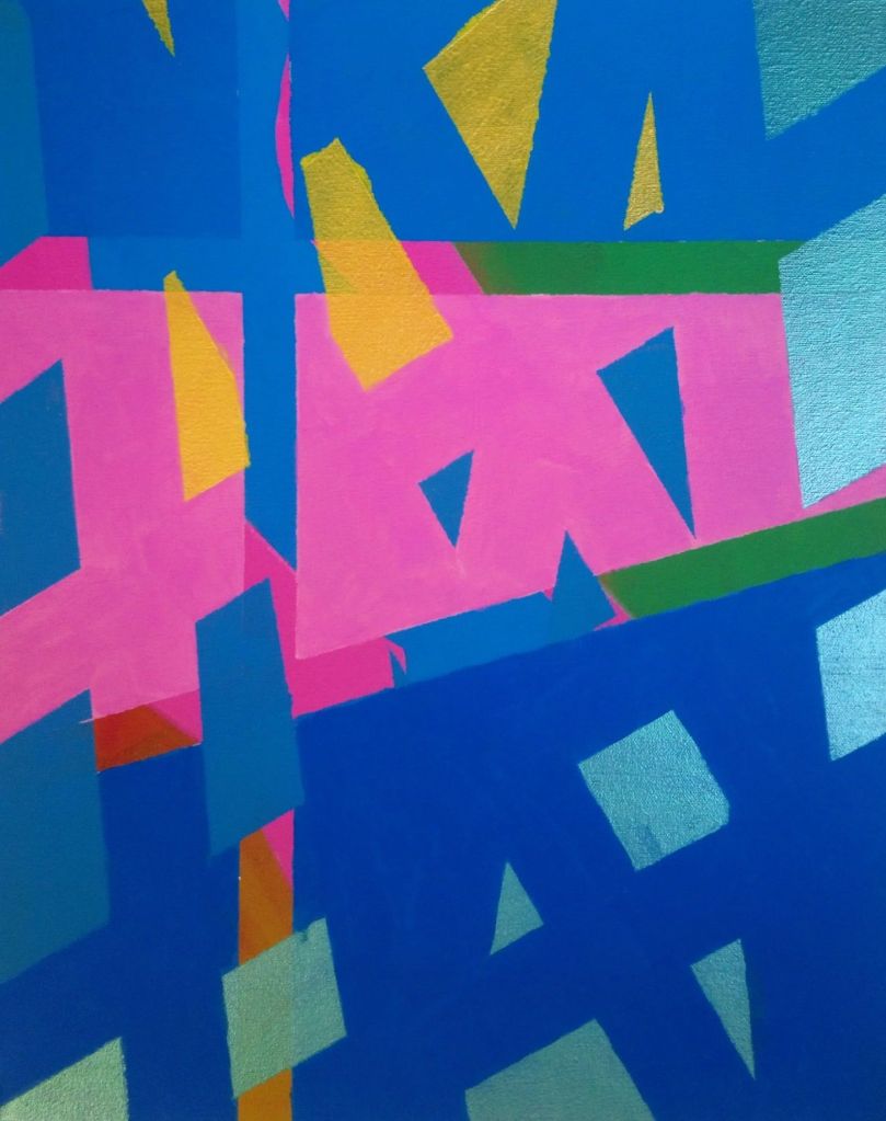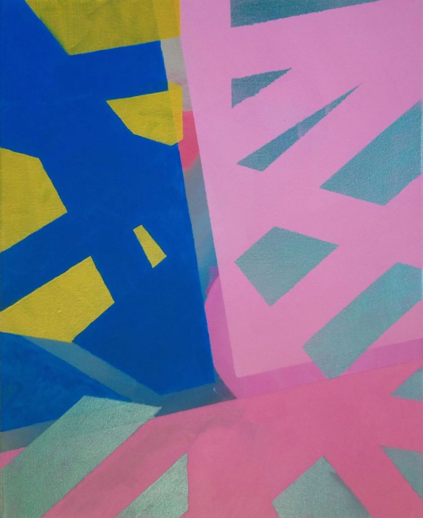 These are a continuation of the Skylights/Set 1 & Set 2 work. Painted in acrylic I used simple tape masks and layers of paint on top of each other to create an illusion of depth, or ‘looking through’ in the use of colour, whilst remaining resolutely flat.