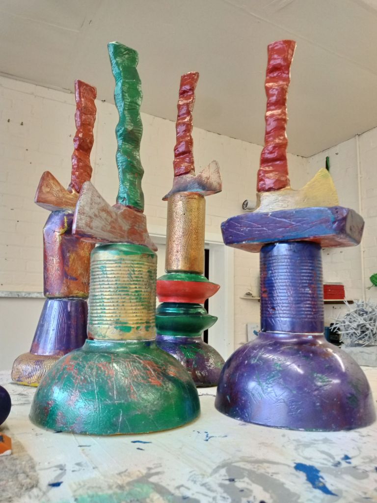 I took a cast of a toy axe similar to that in Arbitrary Axe Arrangement. I then took casts from takeaway cartons and cans to make stands. I then subjected these to carving and painted them up.