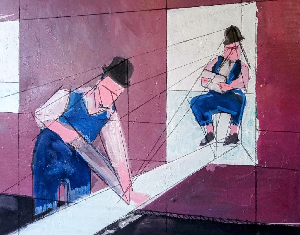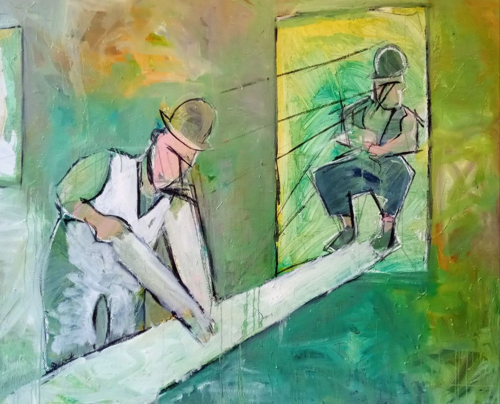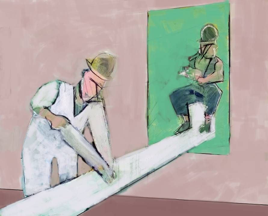 This work took a film still from the Laurel & Hardy film ‘The Finishing Touches’ as its basis. The still was of the scene where Stan is sawing through a plank of wood that is balanced on a window ledge and Laurel is sitting on a box on the end through the window reading a newspaper. I’ve given the work many treatments and interations and will probably continue to do so. I love the structure of the image, the balance, the angles, the composition. I also love the humour, the prank or pratfall in suspension. There’s also the play on ‘work’ or ‘labour’ and the metaphor for the process of ‘making’, be it a house, a shelf or a painting. I probably maxed out on this, over did it, ruined it. But I definitely learnt from it and it’s still there to revisit.